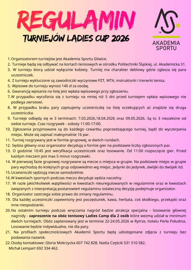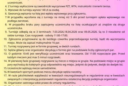 Dodatkową ciekawą nagrodą będzie losowanie obozu weekendowego "Ladies Week" dla pary, która weźmie udział w minimum dwóch turniejach. Losowanie odbędzie się 09.05.2026 podczas wręczenia nagród.